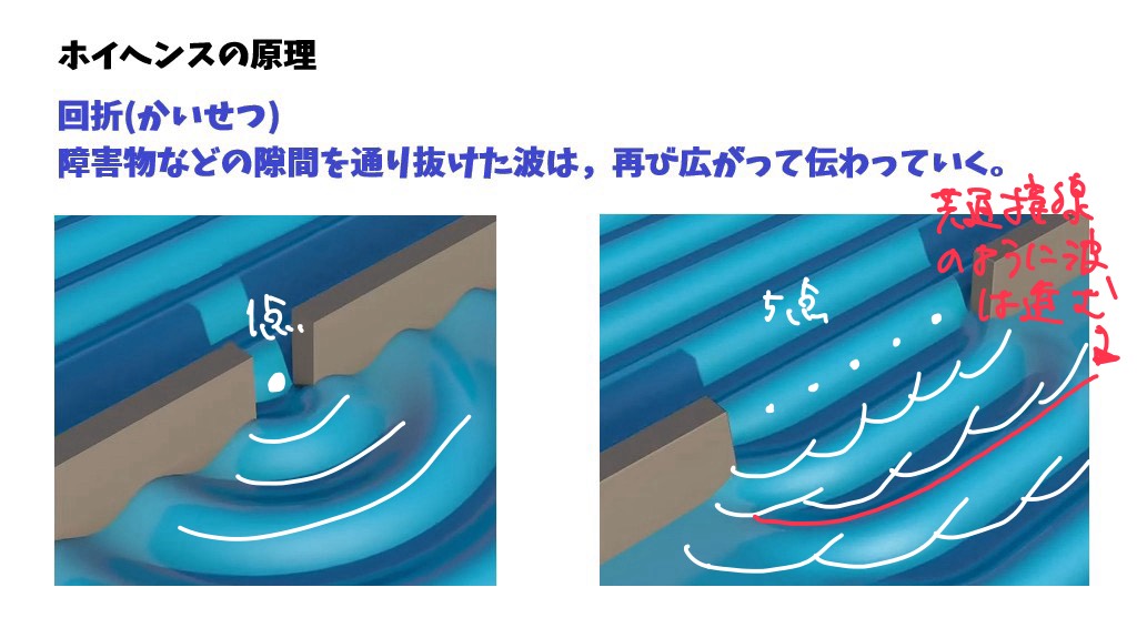 障害物などの隙間を通り抜けた波は,再び広がって伝わっていく。