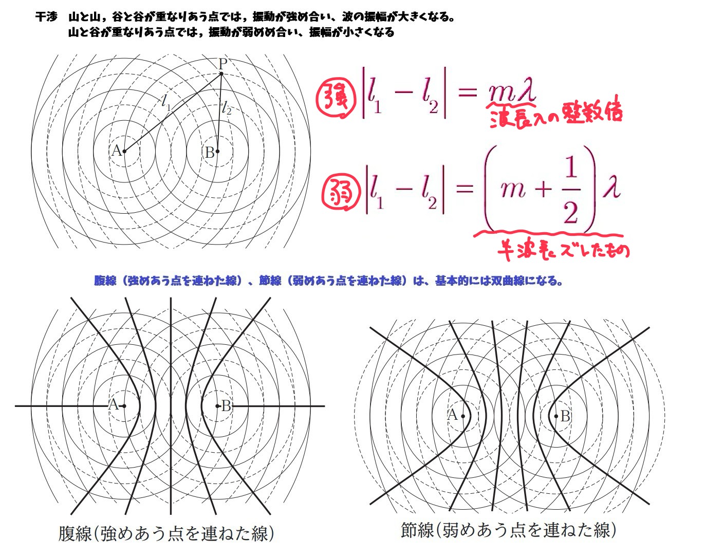 腹線(はらせん:強めあう点を連ねた線)、節線(ふしせん:弱めあう点を連ねた線)は、基本的には双曲線になる。