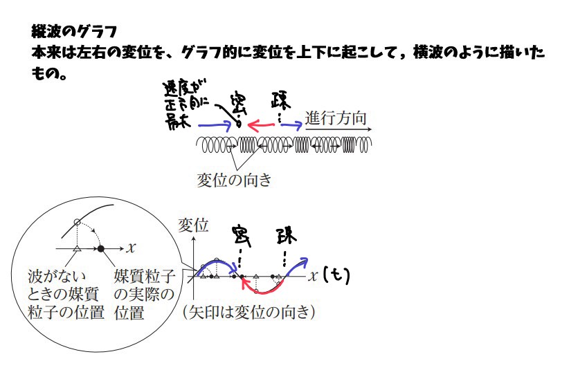 縦波は,媒質粒子が密集した点(密)とまばらになった点(疎)が交互に繰り返して伝わっていくので,疎密波ともいう。
