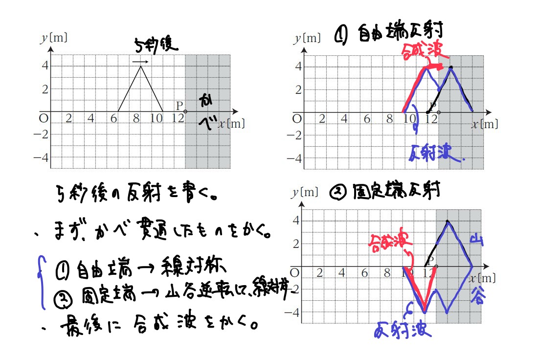端点のところで、山谷逆転して、線対称みたいに反射する