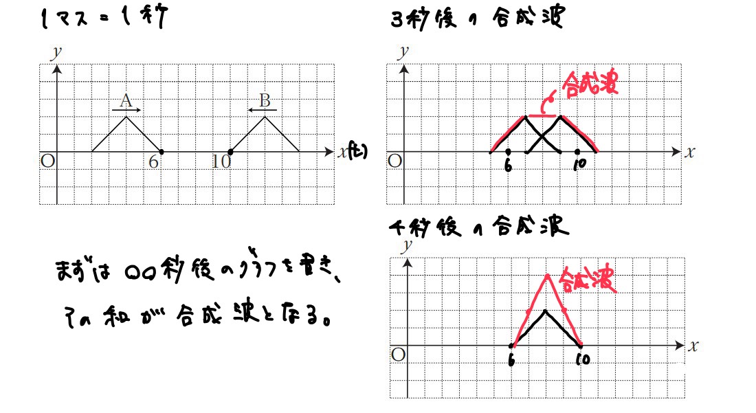 つまり,波が重ね合わさっても,物体どうしの衝突のように,他方の波の進行を妨げたりするようなことはない。
