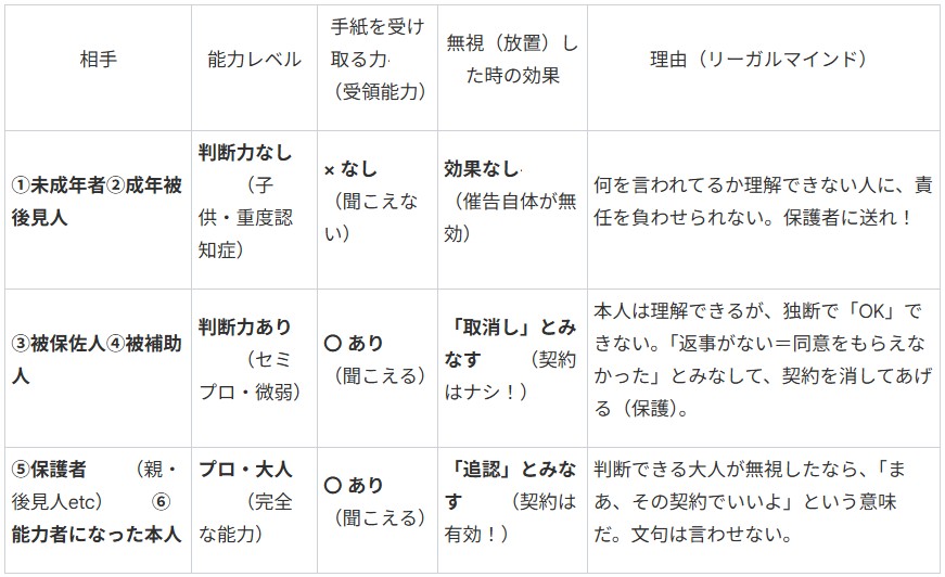 ◦ 被保佐人の場合:受領能力あり。無視=「取消し」。