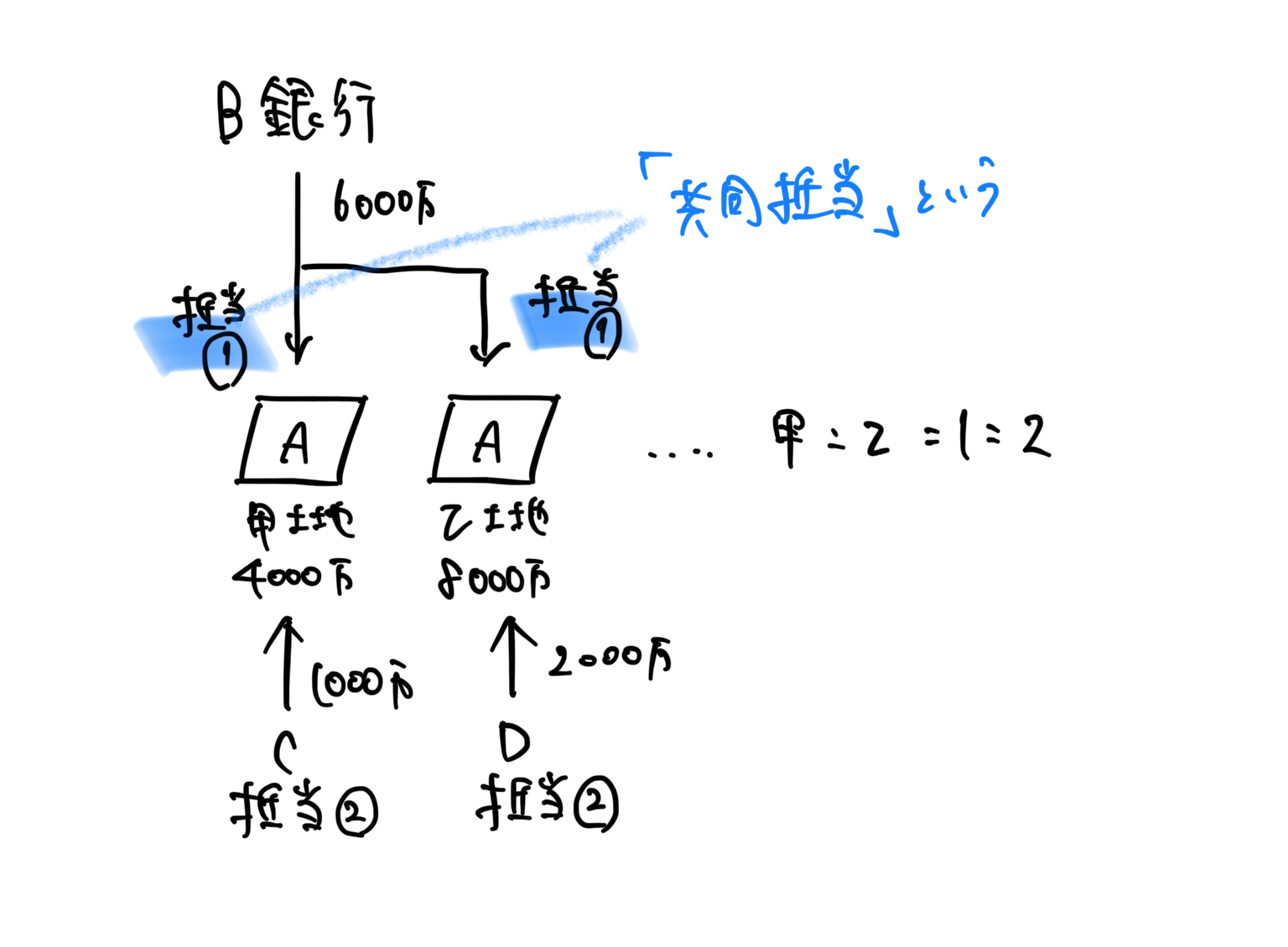 そこでA銀行は、X社の承諾を得て、もともと1つだった極度額1億円の根抵当権を、**「A銀行の極度額7000万円の根抵当権」と「譲渡用の極度額3000万円の根抵当権」**の2つに分割しました。